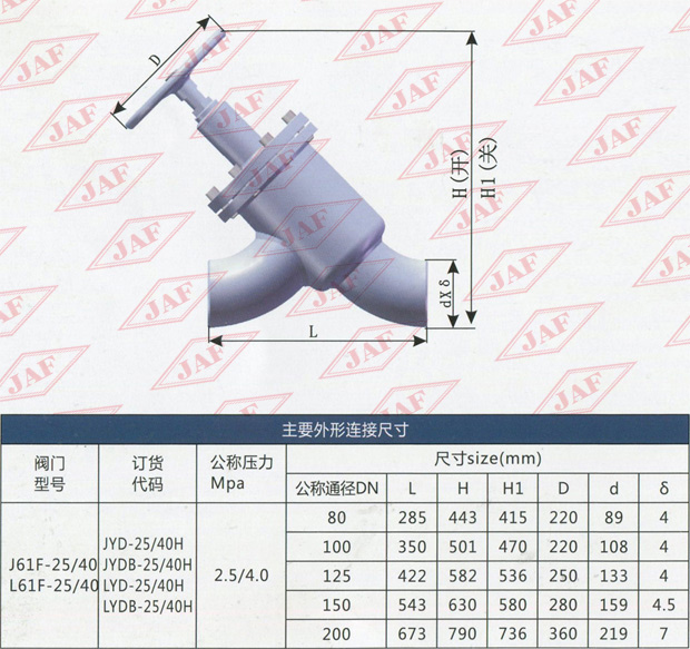 適用范圍 適用于公稱壓力為2.5/4.OMPa.公稱通徑為DN80 -DN200閥體材料為鋼質(zhì)焊接的對焊直流截止閥和節(jié)流閥?! ¢y門屬性 公稱壓力為2.5/4.0MPa,試驗壓力為3.8/6.OMPa,適用溫度j -50°C-+200°C,適用介質(zhì)為氨、氟等?! 表示截止閥 Y表示結(jié)構(gòu)形式為直流式 D表示對焊連接 B代表巴士合金密封 25代表公稱壓力為2.5MPa H代表閥體材質(zhì)為鋼質(zhì)焊接。